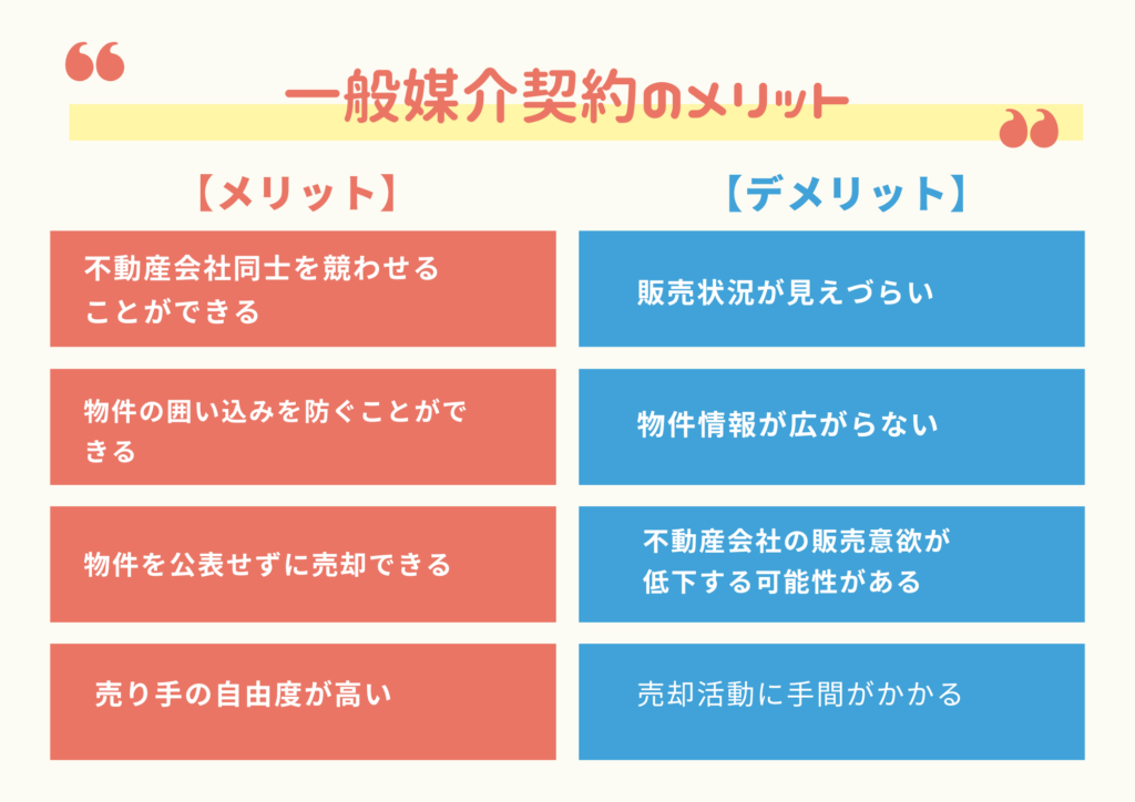 また、一般媒介契約にはレインズへの登録義務がないため、物件情報が市場に出回りにくい面もあるといわれています。しかし、売主自身も積極的に情報発信を行いたいと考える人にとっては、複数の会社を使える点で利点があります。